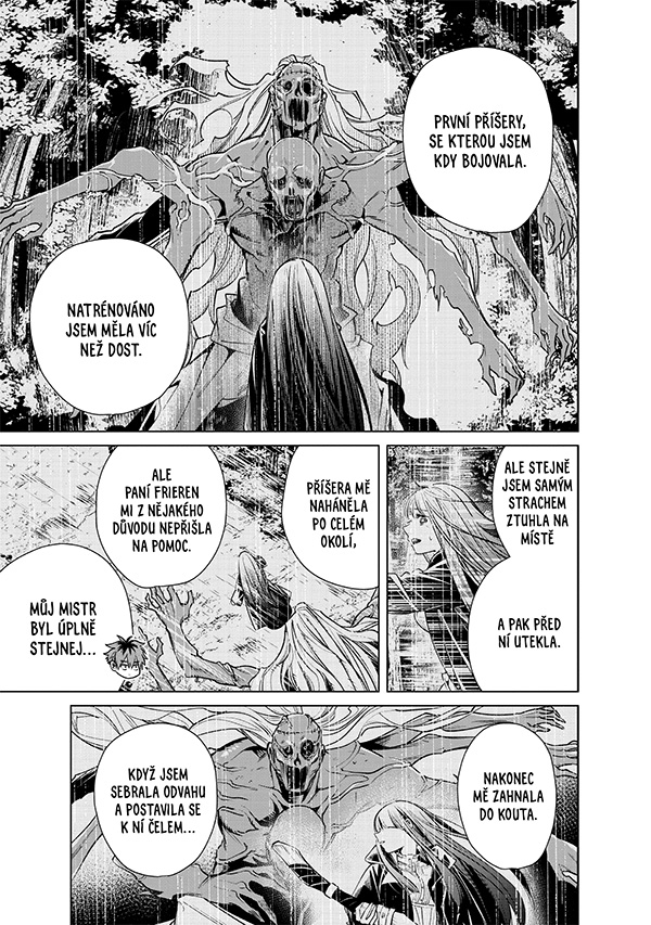 Frieren se svou učednicí Fern po několika letech putování poprvé obrací své kroky k jasnému cíli. Tím je Ende, krajina na dalekém severu, kde údajně odpočívají duše padlých hrdinů – a kde Frierenina družina kdysi svedla vítězný boj s Králem démonů. Přidává se k nim Stark, mladý válečník, který se svému umění učil u samotného Eisena. Nový společník jim přijde vhod: Frieren na její cestě nečekají pouze vzpomínky na minulost, ale také mocní nepřátelé.