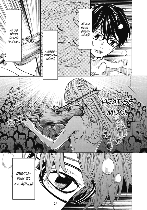 Kósei si konečně připustil, že je do Kaori zamilovaný, a Kaori se pomocí rehabilitace snaží nabrat síly, aby znovu mohla koncertovat. Jenže přání i prosby vycházejí naprázdno a její nemoc se horší… Zvládne Kósei za téhle situace vystoupit na důležité soutěži?