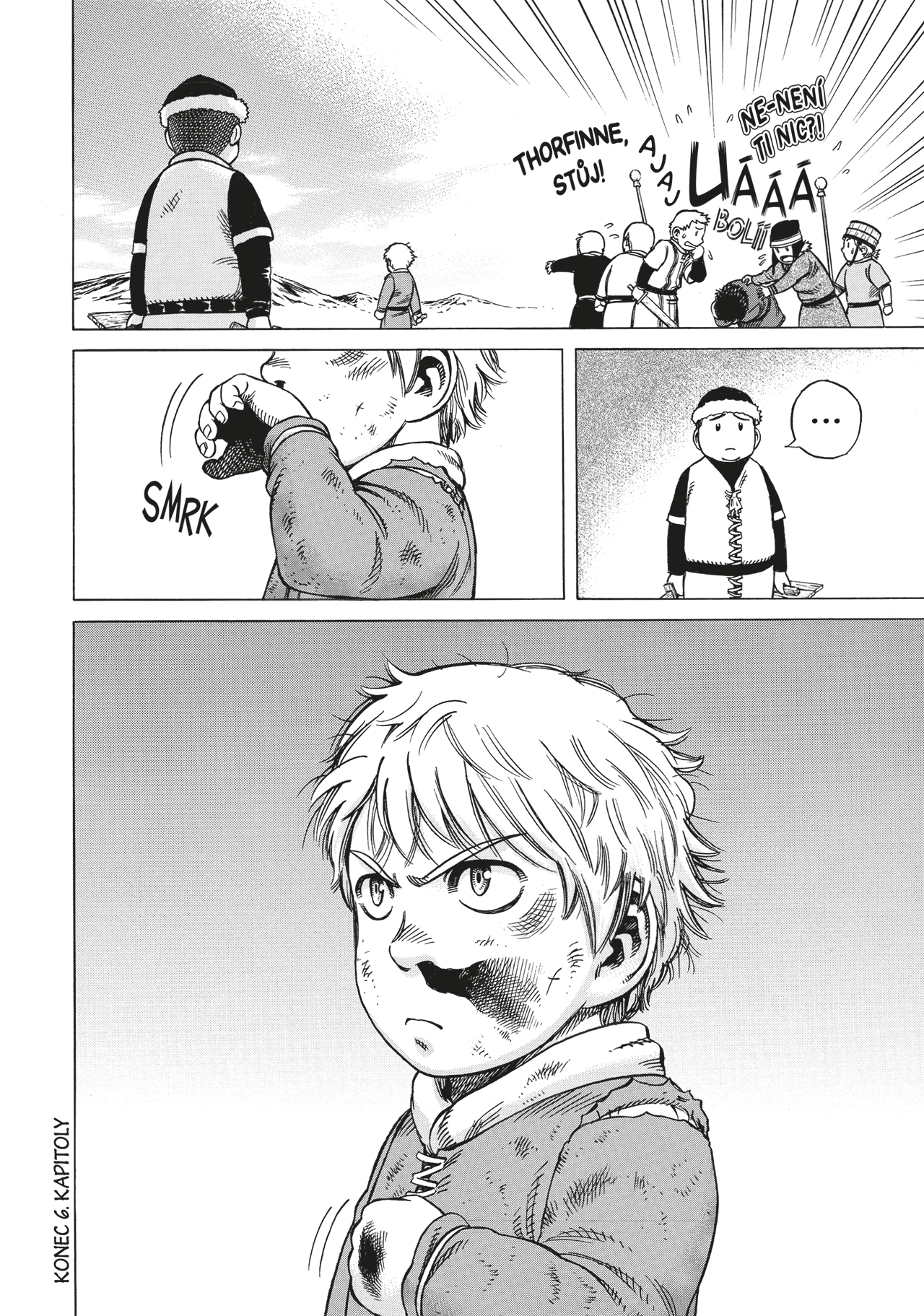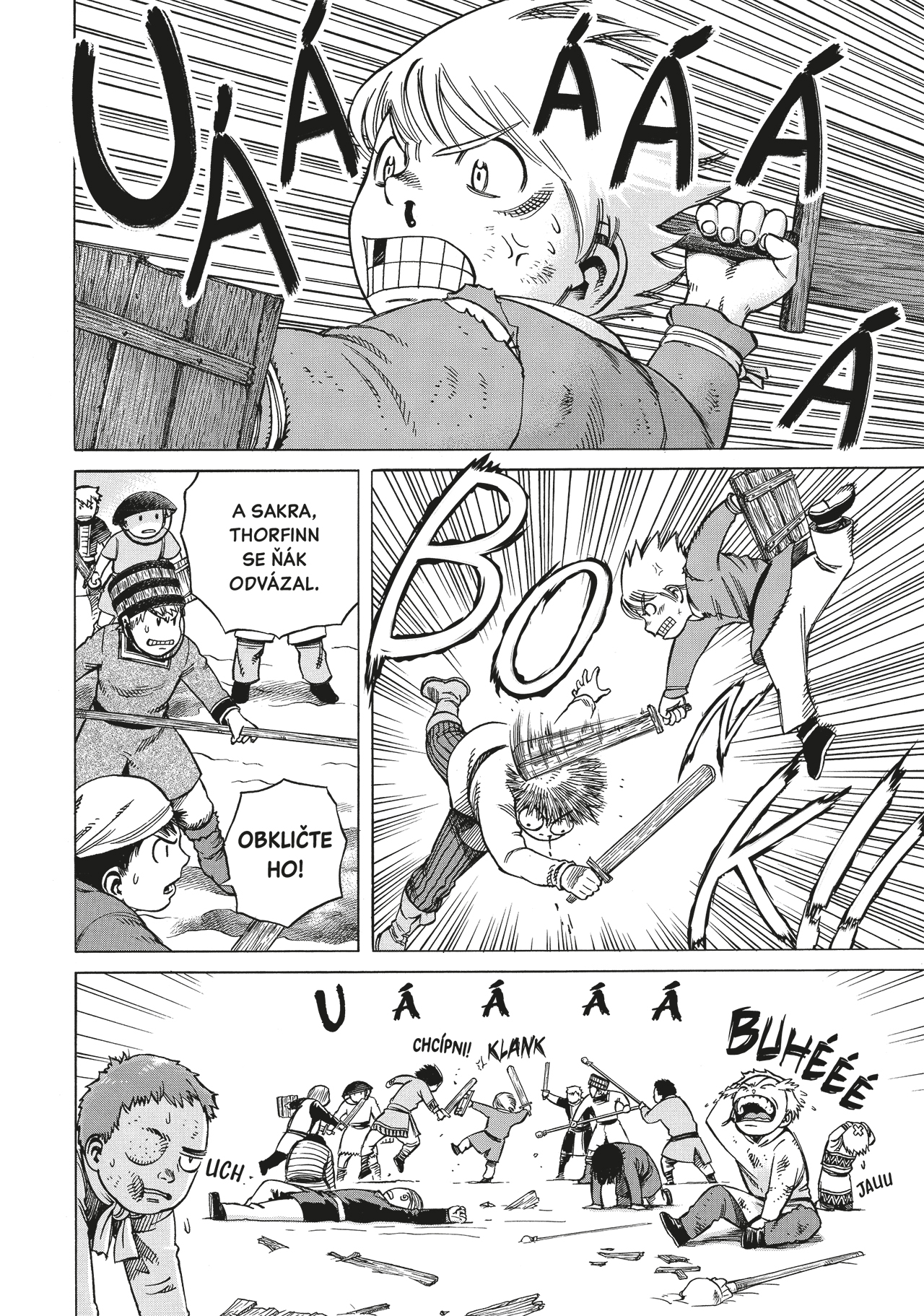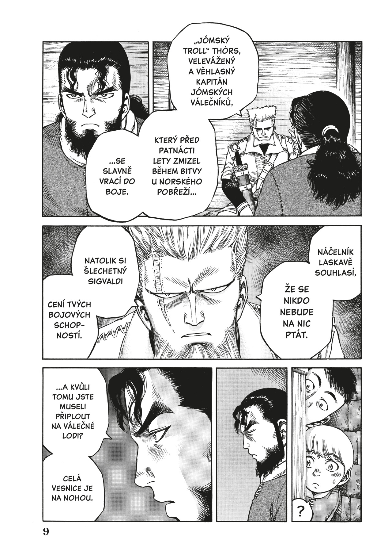 Do islandské vesničky, kde žije malý Thorfinn, dorazila obrovská válečná lod. Muži, kteří si říkají Jómští válečníci, znají Thorfinnova otce jako nemilosrdného bojovníka a chtějí po něm, aby se po jejich boku zúčastnil války, která právě začíná na území Anglie. Nad rodinou, jež si doposud žila v klidu a míru, se stahuje zlověstný stín. Proč vlastně přišel Thorfinnův otec o život? A jak to, že Thorfinn slouží na lodi jeho vraha? Tajemství chlapcovy minulosti je odhaleno…