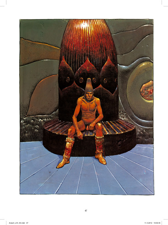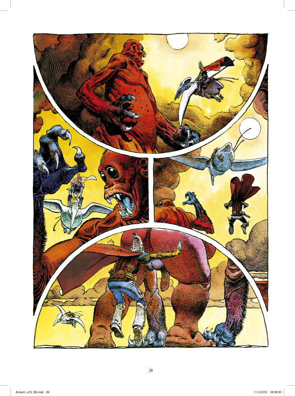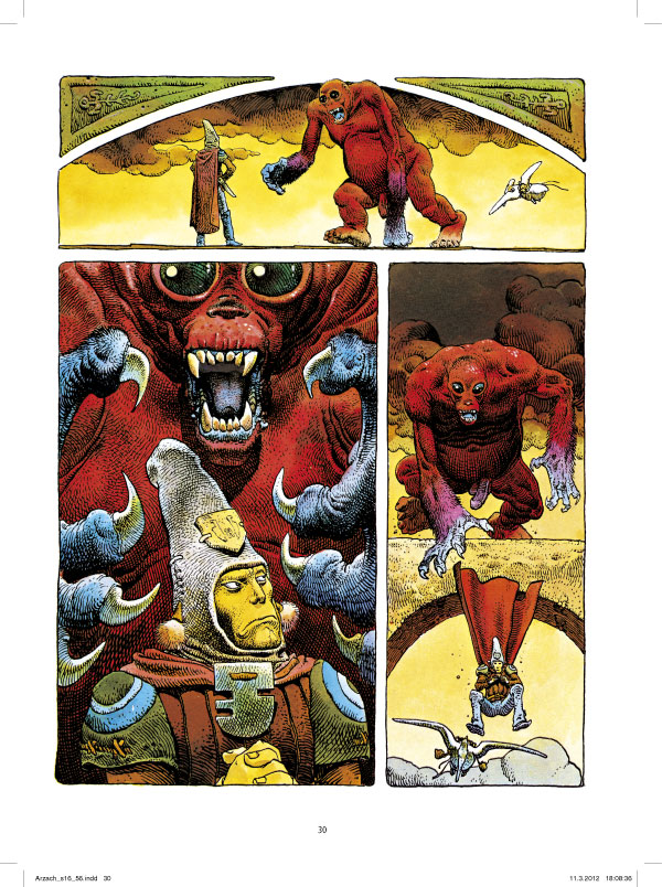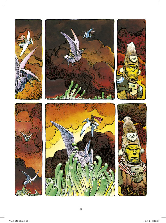 Je to marný, ale já z toho jsem unešenej. Arzach se nedá číst jako normální komiks, prostě to projet a zašoupnout do knihovny. Co obrázek, to samostatnej obraz, každá stránka je výtvarně naprosto geniální a úžasná. Fantastický nápady a výjevy, to je síla Arzacha. Nedivím se, že nakopnul hromady autorů, protože přesně o tomhle Arzach je! Inspirovat, ukázat fantazii bez hranic. Masožravá poušť zelenejch neřádů, uprostřed obr na zbytcích oblouků... no to je prostě... prostě... Prostě člověk má hned chuť vzít tužku a pustit na papír nápady ze všech koutů mozku. /Landauer/