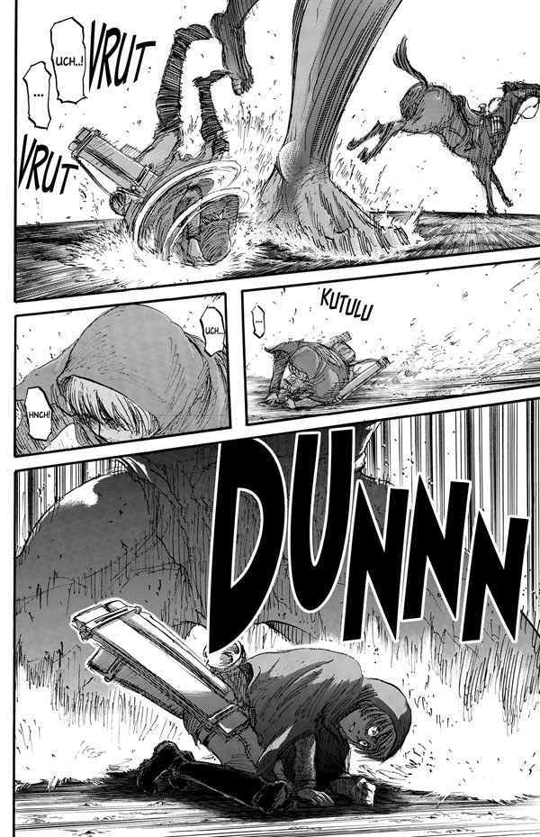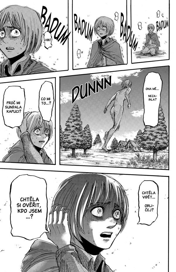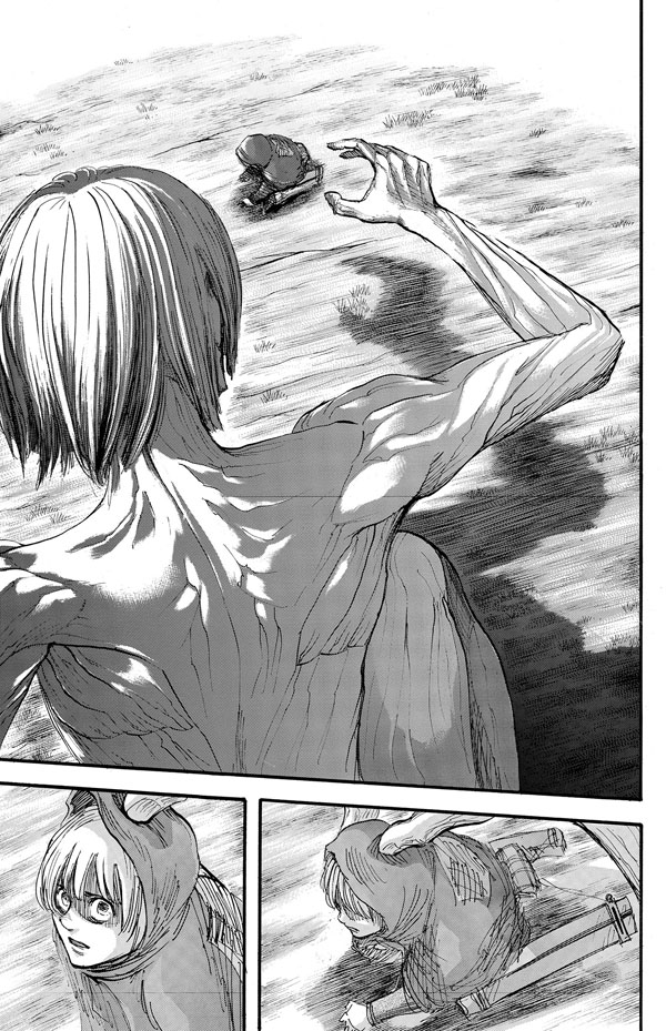 Během výpravy za zeď Průzkumníci narazí na nečekaného protivníka - ženského Titána! Což ovšem neznamená, že by byl o něco méně smrtící. Počet obětí stále stoupá a Eren dostává strach. Zdá se totiž, že se o něj tahle nebezpečná dáma velice zajímá...