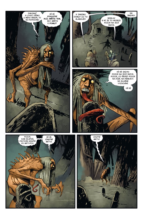 Táto kniha bola mojím prvým kontaktom s fantasy svetom lovca príšer Geralta. Každou stranou sa odvíja kus deja pomaly sa plížiaceho hororu. Čakal som, že Geralt bude zase jeden z tých hrdinov čo povie desať slov za celú knihu. Bol som veľmi príjemne prekvapený keď rozprával príhody a vtipy a slopal víno. Kresba je neskutočne dobrá a miestami docela nezvykle smelá (hrobice). Zaklínač je proste prvotriedny fantasy hororový zážitok. /kadas97/