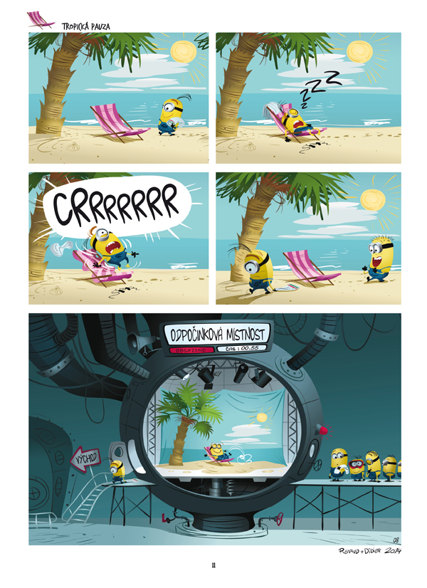 Přicházejí Mimoni! Jak na filmové plátno, tak na komiksové stránky! A zatímco ve filmu se seznámíme s jejich začátky, s jejich přicestováním do Ameriky a s rozjetím kariéry coby superpadoušských poskoků (on je taky jejich původní název Minions, čili takoví ti podržtaškové zločineckých bossů – ale ti čeští „Mimoni“ jim možná sedí více, hlavně když uvážíme jejich úspěšnost), tak komiksová série je už zachycuje v tom nejlepším. Pokud se dá u Mimoňů o tom nejlepším vůbec mluvit. Komiksová série je složená z jednostránkových vypointovaných epizod, které jsou zcela beze slov, takže si komiks můžou užít i ti nejmenší čtenáři... ovšem díky skvělým fórům a lahůdkovému grafickému zpracování potěší i ty odrostlejší.