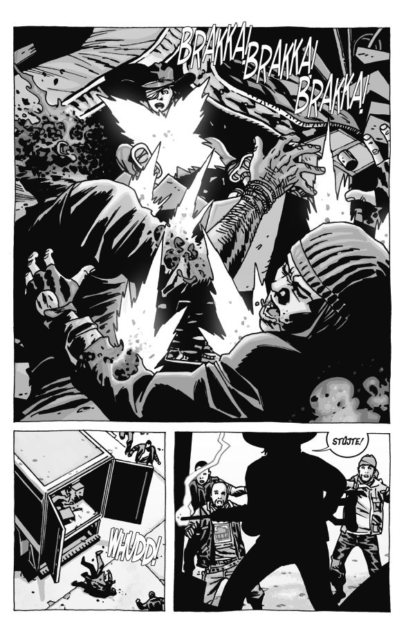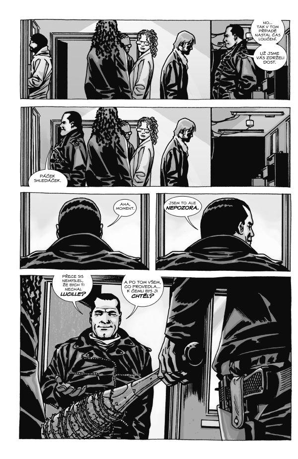 Kolik hodin má den, když jich půlku nestrávíte zíráním na televizi? Kdy naposledy kdokoli z nás DOOPRAVDY pracoval, aby získal něco, co chtěl? Jak je to už dlouho, co kdokoliv z nás doopravdy POTŘEBOVAL něco, co CHTĚL? Svět, který jsme znali, je pryč. Svět komerce a uspokojování zbytečných potřeb byl nahrazen světem přežití a zodpovědnosti. Epidemie apokalyptického rozsahu zachvátila celé lidstvo a přinutila mrtvé povstat a požírat živé. Společnost se rozpadla během několika měsíců. Žádná vláda, žádné supermarkety, žádná pošta, žádná kabelovka. Je tu nový šéf. Vzepřít se jeho rozkazům je nebezpečné... ale přesto je nutné se o to pokusit. Psychopatický, ale bohužel i zatraceně inteligentní Negan se svou krvežíznivou baseballkou Lucille.