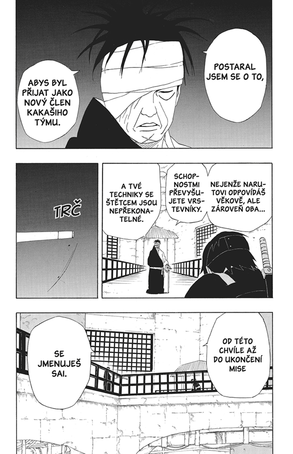 Gaara je zachráněn a tým 7 se vrací do Skryté listové. Doma je však nečekají nejlepší zprávy. Kakaši, vyčerpaný použitím kaleidoskopu, na mise hned tak nevyrazí a ani Naruta by vedení po čerstvých zkušenostech s Akacuki nevidělo na misích bez dozoru rádo. Jenže čas na záchranu Sasukeho se krátí. Naštěstí se nachází náhradní člen týmu – tajemný Sai.