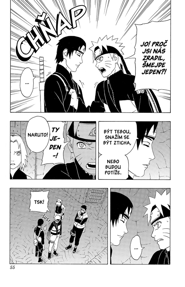 Tým 7 konečně doráží do Oročimaruovy skrýše. Od Saie se dozvídají o zradách a zákulisní politice spojené s dalším Oročimaruovým pokusem o vpád do Konohy a Naruto se konečně setkává se Sasukem.