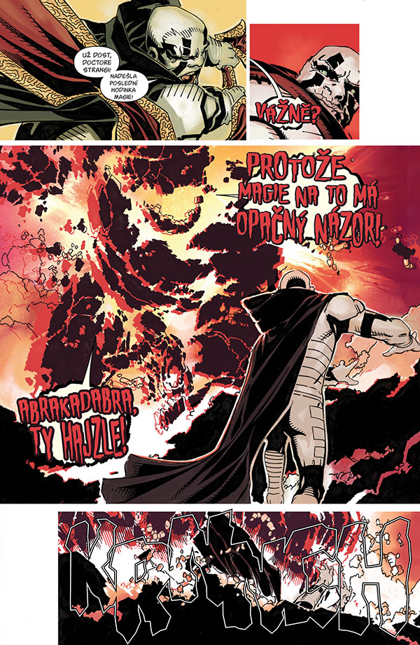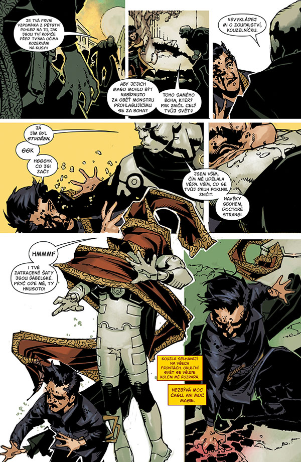 Obsahuje komiksy Doctor Strange (2015) č. 6-10 a Doctor Strange: Poslední dny magie č. 1 - autoři Jason Aaron, Chris Bachalo, Tim Townsend, Al Vey, Mark Irwin, John Livesay, Wayne Faucher, Victor Olazaba, Jaime Mendoza, Java Tartaglia, Antonio Fabela, Rain Beredo a další.