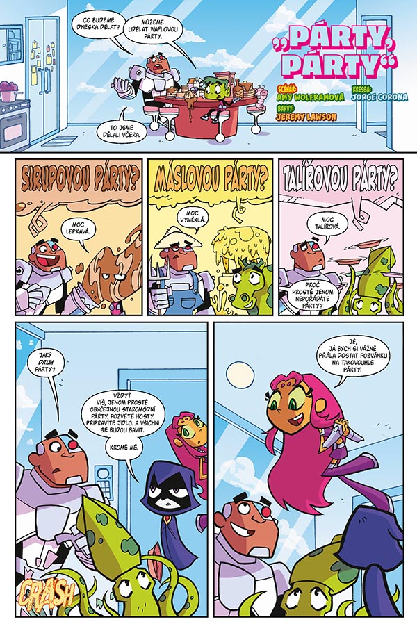 Mladí titáni do toho!: Párty, párty! obsahuje díly 1-6 původní, psinou naplněné série založené na animovaném seriálu. Na tomto komiksu se podíleli takoví borci jak Sholly Fisch, Lea Hernandezová, Amy Wolframová, Jorge Corona, Ben Bates... a spousta dalších!