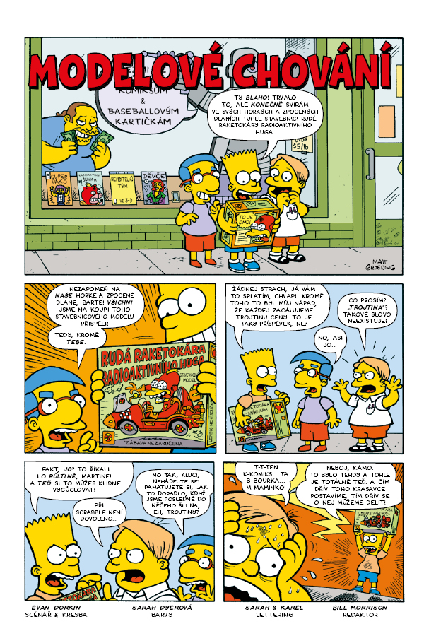 Bart a spol. si pořídí model káry Radioaktivního Huga. Jenže se musí slepit. Což je v rukou šikovných lidí hračka, v rukou Barta katastrofa. A co teprve, až se pustí do sprejové bitvy s... ředitelem Skinnerem? Komiks, který vám přilepí úsměv k obličeji!