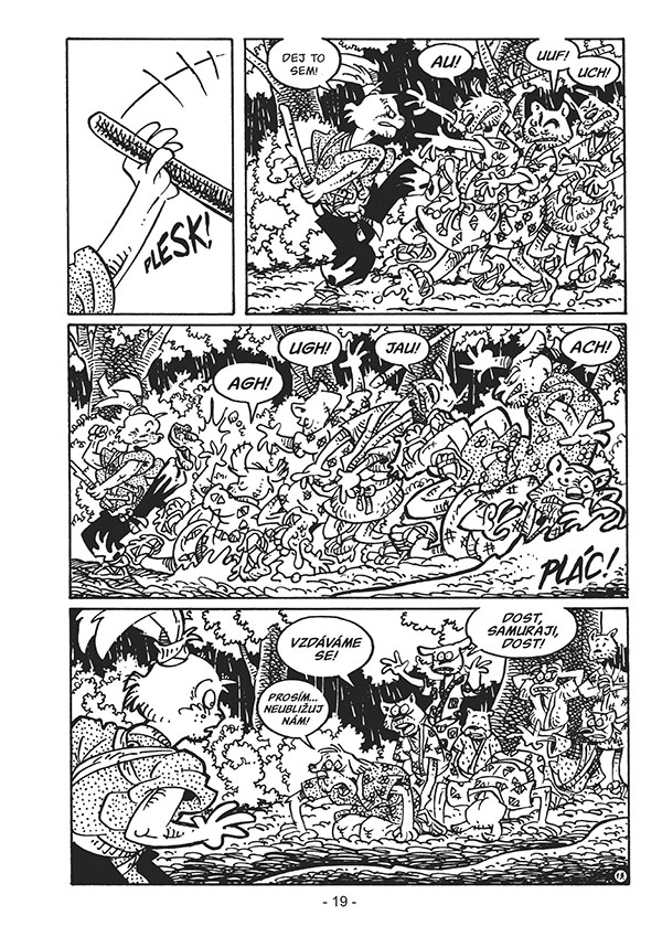 V této napínavé knize musí králičí ronin spojit síly s mnoha podivnými postavami - a s mnohými se také utkat! Nejdříve jsou to banditi loupící ve vesnici ohrožené záplavami... jejichž důvod ke krádežím otřese i těmi nejotrlejšími. Později přijdou na řadu mytické bytosti, okřídlení komori ninjové a vrátí se také inspektor Ishida, který bude potřebovat Usagiho pomoc při řešení série záhadných úmrtí. Je možné, aby za tím vším opravdu stála kletba Pekelné malby?