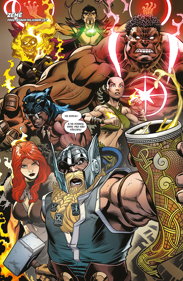 Steve Rogers. Tony Stark. Thor Ódinson. Velká trojka se dala znovu dohromady. A právě v ten správný čas - musí zachránit svět před dvoukilometrovými kosmickými bohy známými jako Nebešťané. Střezte se Poslední návštěvy. Ale kdo další odpoví na jejich volání? Black Panther a Doctor Strange bojují o svůj život v hlubinách Země, Captain Marvel čelí smrti a zkáze, která padá dolů z nebe. A nenudí se ani zuřivá She-Hulk a zbrusu nový Ghost Rider. A žádný sraz Avengers samozřejmě nemůže být kompletní bez jistého prince lží. Ale jaké spojení je mezi temnými Nebešťany a Ódinovou pravěkou skupinou prehistorických Avengers?