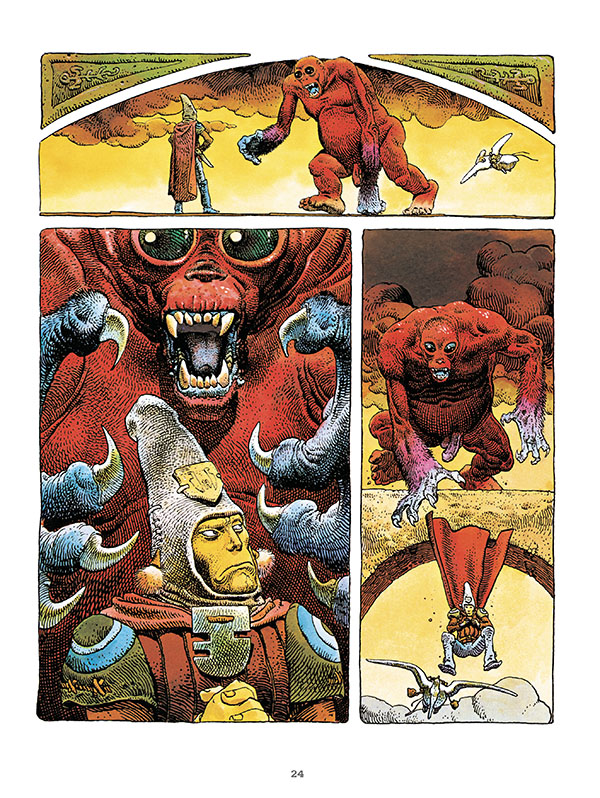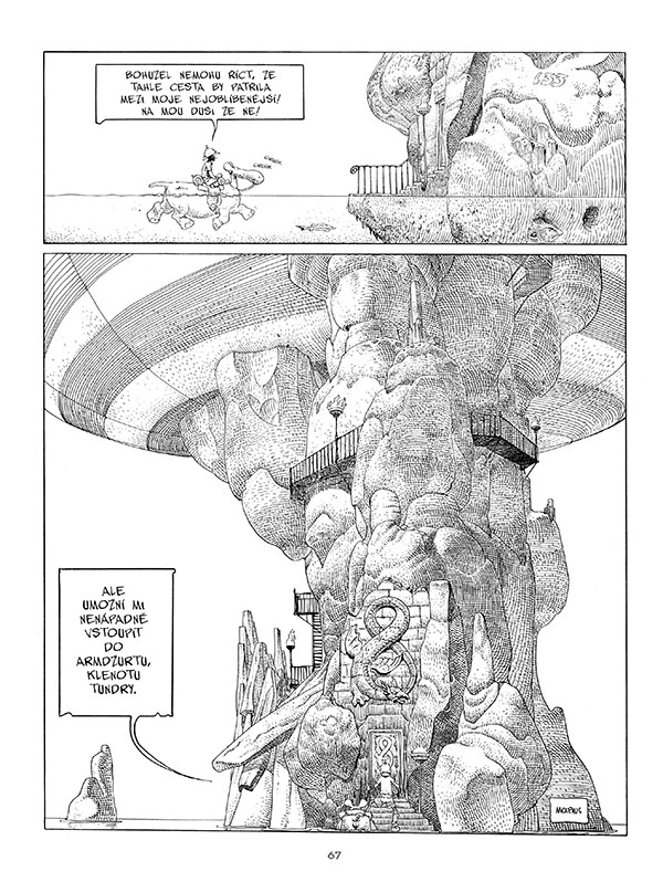 Mlčenlivý bojovník prolétá fantaskními světy, aby sváděl kruté a komické boje s bizarními a obřími protivníky. Snové sci-fi příběhy zasahující čtenáře melancholickou náladou a neuchopitelnou atmosférou. A spolu s ním přicházejí bizarní příběhy dadaistického rázu jménem Hermetická garáž! Dva příběhy, které předvádějí Moebia v jeho nejlepší formě a podobě. Vychází ve velkém, luxusním vydání, doplněném o důkladný rozbor Moebiova díla a malířského stylu!