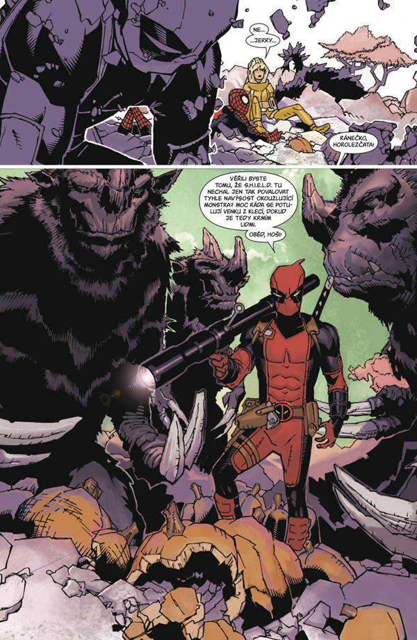 KDYŽ SPIDEY ZJISTÍ, že Wade prodává arzenál S.H.I.E.L.D.u na černém trhu, je to poslední kapka – romantické bratříčkování končí. Dva největší hrdinové všech komiksů si jdou po krku, a to bez rukavic. Jejich souboj je protáhne celým marvelovským vesmírem – a vyvrcholí střetnutím s Chameleonem! Ten se stačil z malého mizery změnit v jednoho z nejděsivějších superzločinců světa. Spidey i Deadpool dělají všechno pro to, aby ho dostali, jenže ono je dost těžké mlátit někoho, kdo může vypadat jako kdokoliv jiný! Podaří se ho naší dysfunkční dvojce zastavit (přičemž by mu Deadpool ještě rád vyfoukl parádní lup) dřív, než se stane něco tak strašlivého, že to bude naše hrdiny pronásledovat po zbytek jejich životů?