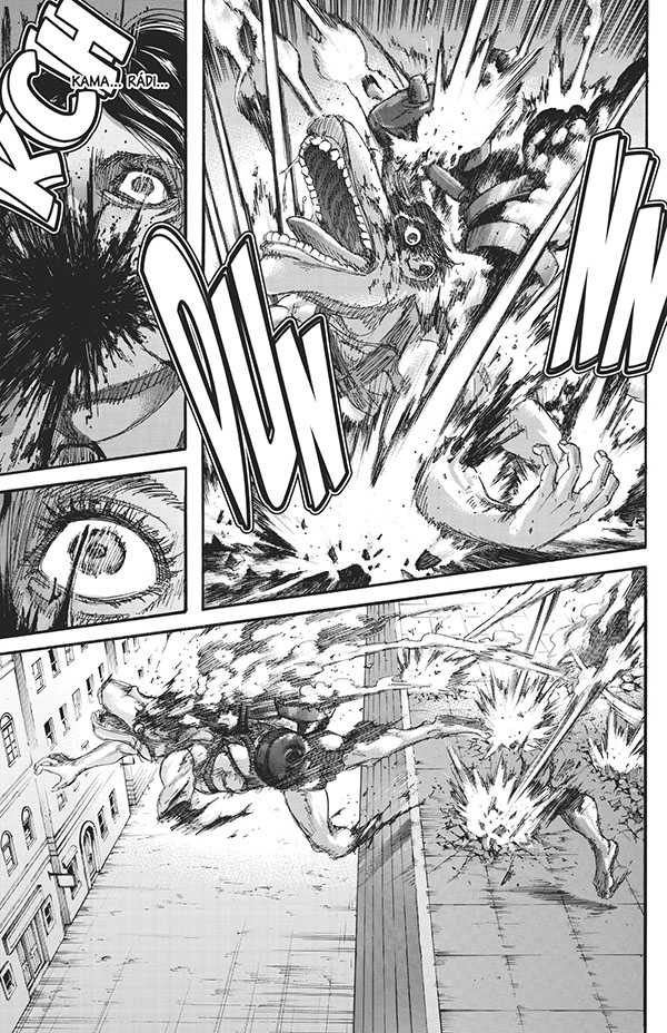 Nečekaná bitva v samém srdci Marleyské říše vrcholí! Na obou stranách bojují lidé i titáni – a vyhrát může jen jeden ze znesvářených protivníků. Povede Erenův šílený plán ke kýženému výsledku, nebo se marleyským bojovníkům z řad porobených Eldiánců podaří svou adoptivní vlast ochránit?