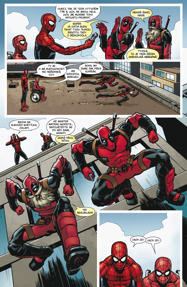Jenže jaká temná energie tuhle armádu nepravých robotických Deadpoolů vlastně pohání? A co to má celé společného s rodiči úžasného Spider-Mana, Mary a Richardem Parkerovými? Zrovna když jste si výjimečně o někom mohli pomyslet, že na něm není ani špetka něčeho nekalého, přijde Deadpool a udělá vám zase čáru přes rozpočet. A navíc: Jestli chce staroch Parker porazit Fejkpoola, kvůli němuž už nemůže skákat přes kaluže, bude muset učinit rozhodnutí, které změní jeho budoucnost – a naši současnost! Setkáte se tady taky s Master Matrixem: Může sice být tím nejmocnějším androidem na zeměkouli, ale v mezilidské komunikaci stále ještě značně pokulhává. Kdo jiný by ho měl v téhle oblasti dovzdělat než Spider-Man a Deadpool? Master Matrix září v příběhu „Mám dva taťky“ – a celá tahle dysfunkční rodinka má namířeno do Divočiny!