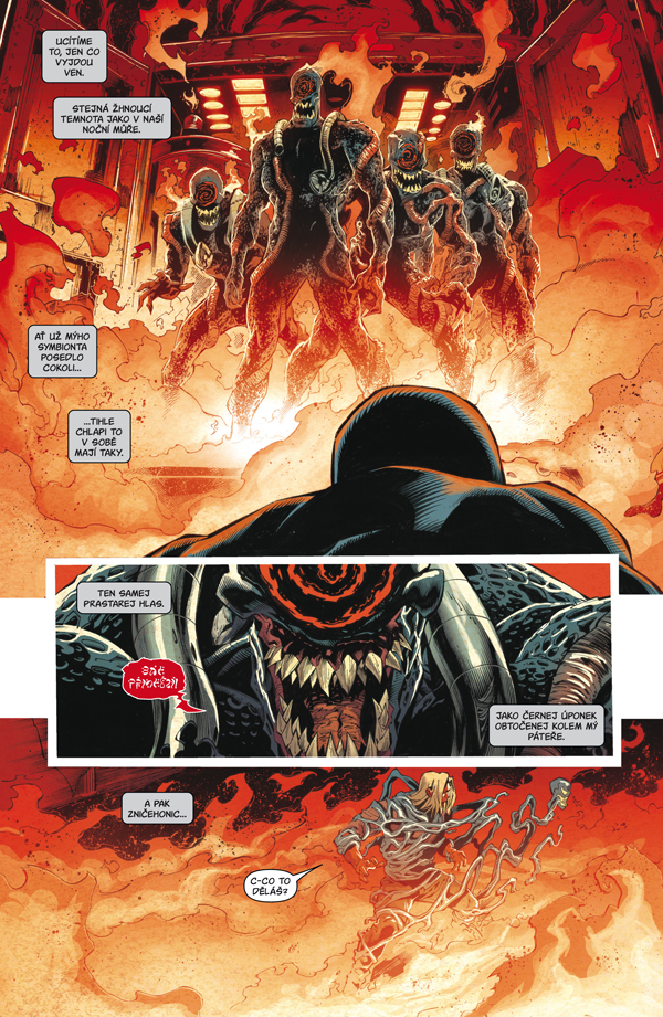 A SPOLEČNĚ S NÍM PROCITLO NĚCO SROVNATELNĚ ZLÉHO i v nejhanebnějším ze snovačů pavučin – ve Venomovi! Tento symbiont nadále zůstává smrtícím ochráncem nevinných v New Yorku, dříve nevídaná hrozba ho však může přinutit vzdát se všeho, co je mu drahé – včetně jeho lidského hostitele, Eddieho Brocka. Jen co Eddie a Venom seberou síly, aby se postavili vůbec nejmocnějšímu soupeři, jakému kdy čelili, do cesty se jim postaví někdo jiný: Miles Morales, Spider-Man! Dva nejhustší tvůrci dnešního komiksového světa, Donny Cates a Ryan Stegman, uvrhnou společnými silami Venoma do noční můry staré skoro jako vesmír sám.
