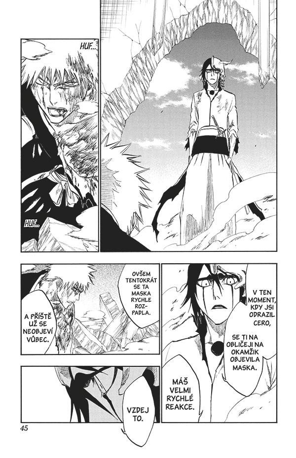 V Hueco Mundo přituhuje. Chad i Rukia jsou ze hry, Urjú a Rendži z posledních sil čelí šílenému vědci Szayelaporovi a na Ičiga čeká střetnutí se dvěma elitními členy Espady – Ulquiorrou a Grimmjowem. Oba si přejí jeho smrt a přinejmenším jeden z nich doufá, že bude dlouhá a bolestivá...