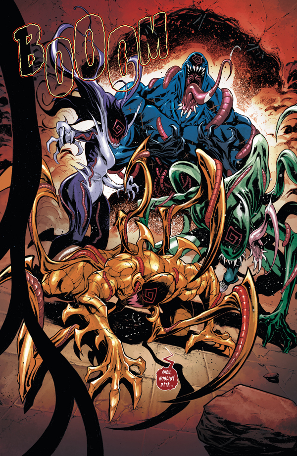VRAŽEDNÝ SYMBIONT CARNAGE SE VRÁTIL a Venom nyní musí ochránit svého syna Dylana – a to za každou cenu! Venom a Carnage však nejsou jedinými symbionty ve hře – a to znamená další, dosud nevídané hromady mrtvol! Rozpoutává se peklo a Carnageova armáda zaplavuje ulice New Yorku. Co všechno se semele, až se objeví další Venomovi potomci? A aby těch problémů nebylo málo, vyjde najevo, že se v Dylanovi skrývá víc, než si Venom, Carnage a dokonce i Reed Richards z alternativní reality doposud uvědomovali. Tihle tři se dozvídají pravdu o synovi Eddieho Brocka, a to znamená jediné – nikdy už nic nebude jako dřív!