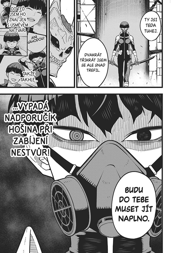 Kafka se opět přeměnil do své nestvůrné podoby, aby zachránil Ičikawu s Furuhašim před záhadnou humanoidní nestvůrou. Své spolubojovníky možná ochránil, ale jak dlouho před nimi ještě udrží své tajemství? Je totiž čím dál tím jasnější, že ostrému zraku nadporučíka Hošiny jen tak něco neunikne...