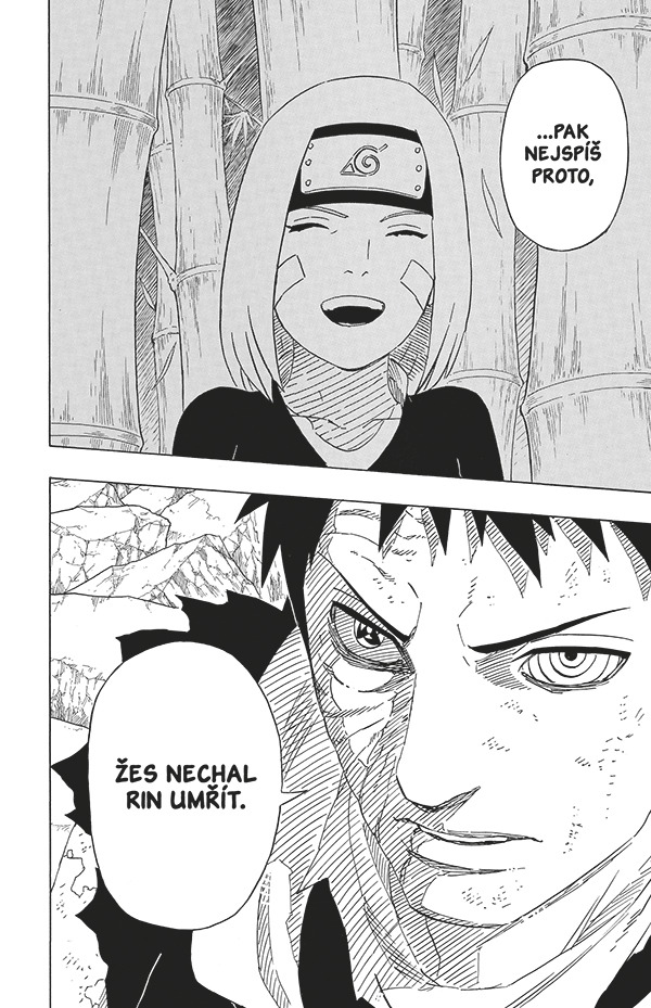 Naruto a jeho přátelé konečně přišli na kloub tomu, jak porazit zdánlivě neporazitelného Tobiho. V Kakašim dál sílí pocit, že mu Tobiho techniky něco připomínají. Mezitím Naruto, důvěřující svým spolubojovníkům, podniká odvážný útok a konečně ničí Tobiho masku. Co se však skrývá pod ní?
