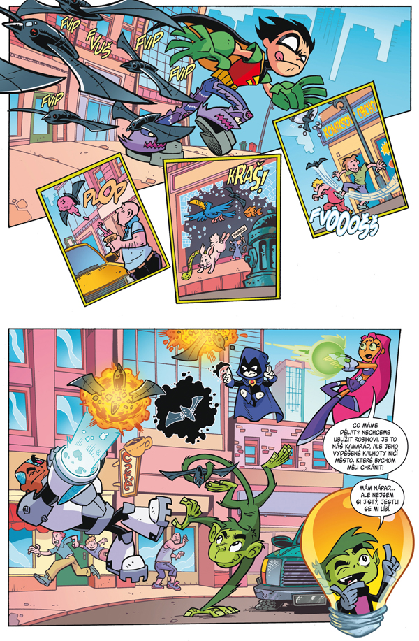 Přicházejí Mladí Titáni, superhrdinové, jaké jste ještě nepoznali. Jejich hlavní náplní života je pizza, počítačové hry, televizní seriály, vzájemné spory… a když jde do tuhého, tak i nějaká záchrana města. V této knize dojde na prokleté kalhoty, výlet v Batmanově autě, silně nepřátelský přátelský zápas, život pod mořem, vílu kmopsenku, vzbouřené zuby a spoustu dalších vylomenin!