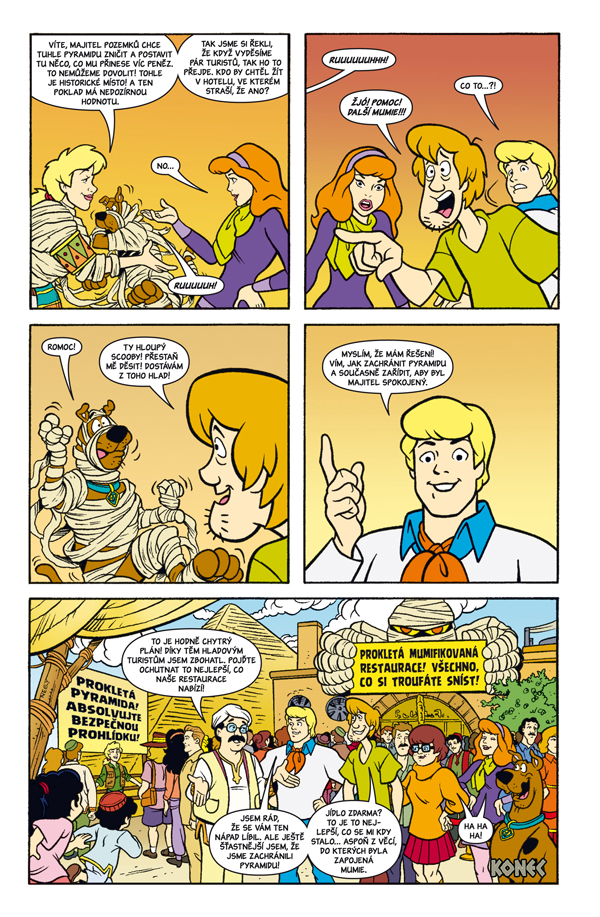 Záhady s.r.o. vyráží do akce a žádný přízrak si před nimi nemůže být jistý! V téhle nadupané knížce se pustí hned do osmi velkých případů, které prověří Velminy znalosti, Fredovu vynalézavost, Daphneinu ráznost… a zbabělost i apetit Scoobyho a Shaggyho! Dojde na postrach westernového městečka, nebezpečnou mumii, petardový přízrak, staré hrady, prokleté talismany, kouzelnická vystoupení a hororový con (samozřejmě s jedním duchem navíc)!