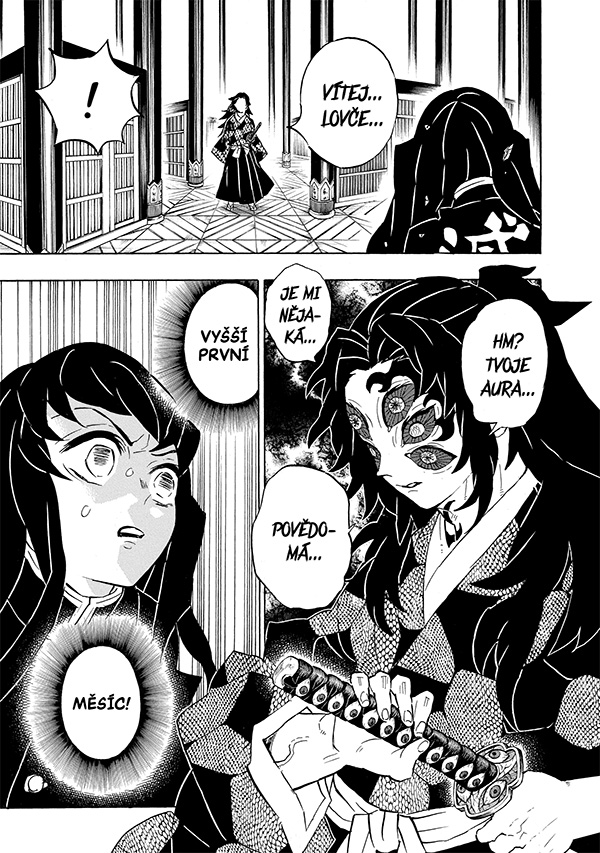 Souboj Kanao a Inosukeho proti vyššímu druhému Měsíci Dómovi nabírá na obrátkách. Mocný démon, který oba dva připravil o rodinu, je ovšem svojí krvavou magií zahání do kouta. Dokážou nakonec svoje blízké pomstít?