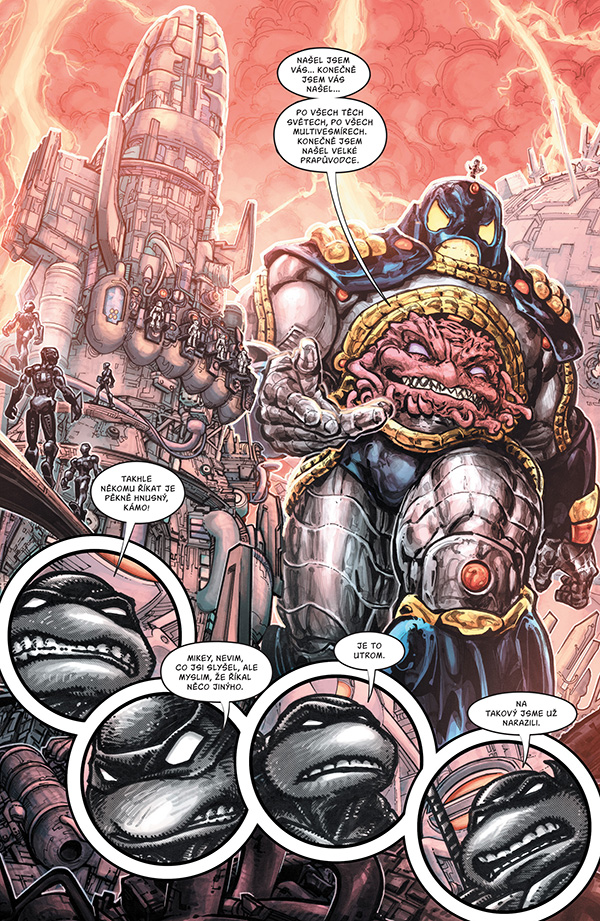Velkolepé dobrodružství se odehrává v komiksu BATMAN/ŽELVY NINDŽA: Krize v krunýři v ohromujícím crossoveru od scenáristy Jamese Tyniona IV a výtvarníka Freddieho E. Williamse II... za účasti zvláštního hosta Kevina Eastmana, legendárního spolutvůrce Želv nindža! Komiks obsahuje sešity BATMAN/ŽELVY NINDŽA: Krize v krunýři č. 1–6.