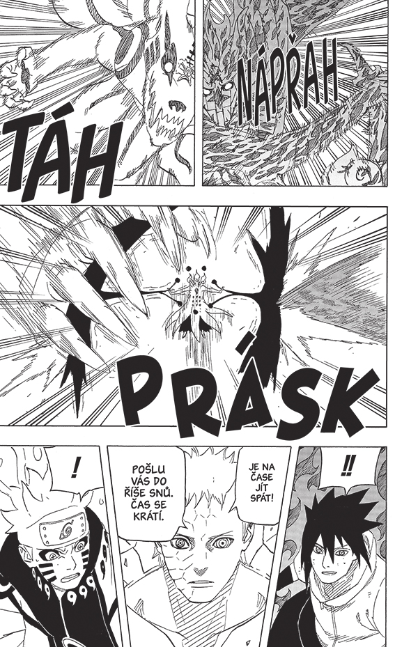 Narutovo odhodlání brání Spojencům podlehnout zoufalství, i když proti nim stojí nepřítel, jakému svět ještě nečelil! Pět současných vůdců vesnic se na bojišti připojuje k hlavním jednotkám, zatímco Naruto se Sasukem spojují síly, aby zastavili Obitovu nekonečnou Cukujomi.