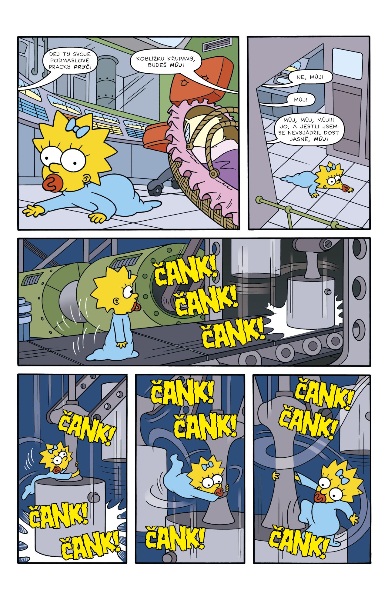 Připojte se k Bartu Simpsonovi a jeho kamarádům, kteří se utkají o titul třídního klauna, přelstí robotického školníka propadlého amoku, zasurfují si na sociální síti i v obrovské kaluži bláta, naučí se hrát blues, získají zpět elán a mnoho, mnoho dalšího! Dokonce i v případě, že si nosíte oběd v krabičce, tahle knížka vám zaručí, že splníte a dokonce i překročíte doporučenou denní dávku smíchu.