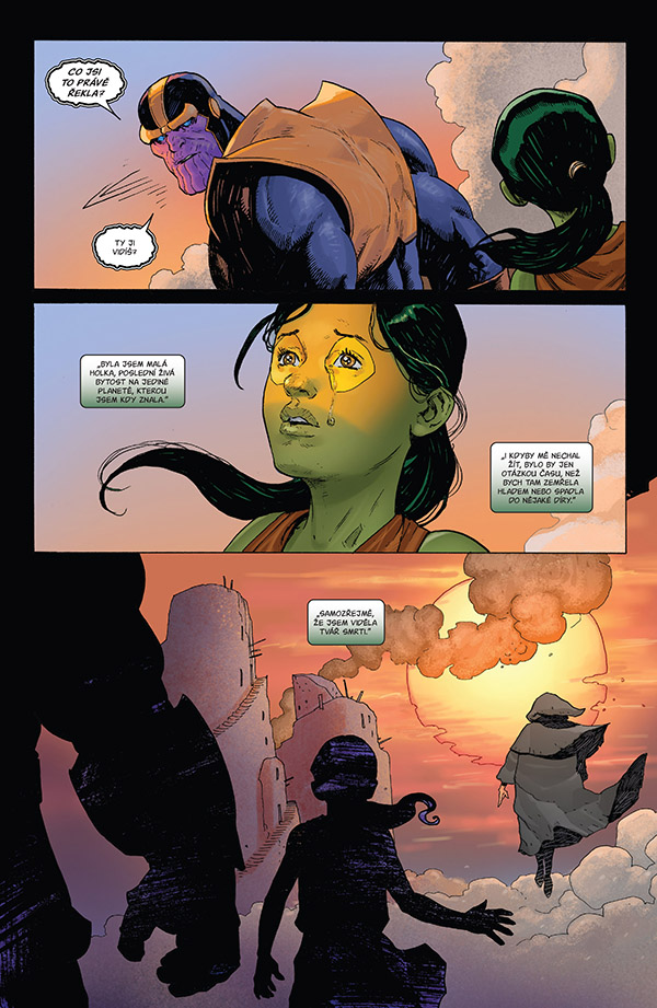 Šílený Titán byl popraven nejsmrtonosnějším zabijákem v celé Galaxii: svou adoptivní dcerou Gamorou! Jak však tento vyšinutý rodinný vztah, který právě dospěl ke svému krvavému konci, vlastně začal? Přesuňte se časem do Gamořina dětství, konkrétně do dne, kdy se její život navždy změnil. Jakým otcem jí byl brutální a nelítostný Thanos z Titanu? Zformoval ji do pozdější podoby on sám, nebo se Gamora už narodila předurčená stát se jednou z nejzběsilejších válečnic v kosmu? Souběžně s tím, jak se formuje Thanosův nechvalně proslulý Černý řád, začíná tváří v tvář propukající válce Gamořin výcvik! Jenže když začne hrozit riziko vzpoury, je jasné, že Thanos udělá cokoliv, jen aby si svou moc udržel – a to za jakoukoliv cenu. Řetězec událostí spustí orgie krveprolití a zrady v celé galaxií… ale co má s tím vším společného Magus?